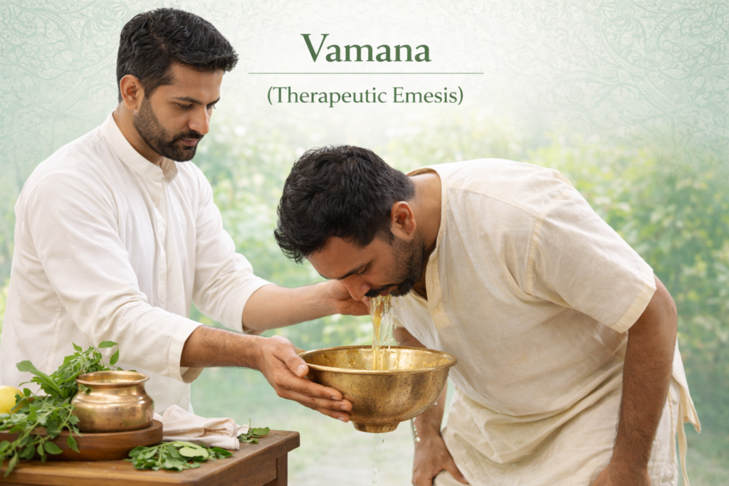 Vamana is a carefully supervised therapeutic procedure used to eliminate excess Kapha dosha from the body. It is beneficial in conditions like respiratory disorders, allergies, skin diseases, and metabolic imbalance by cleansing the upper digestive tract.