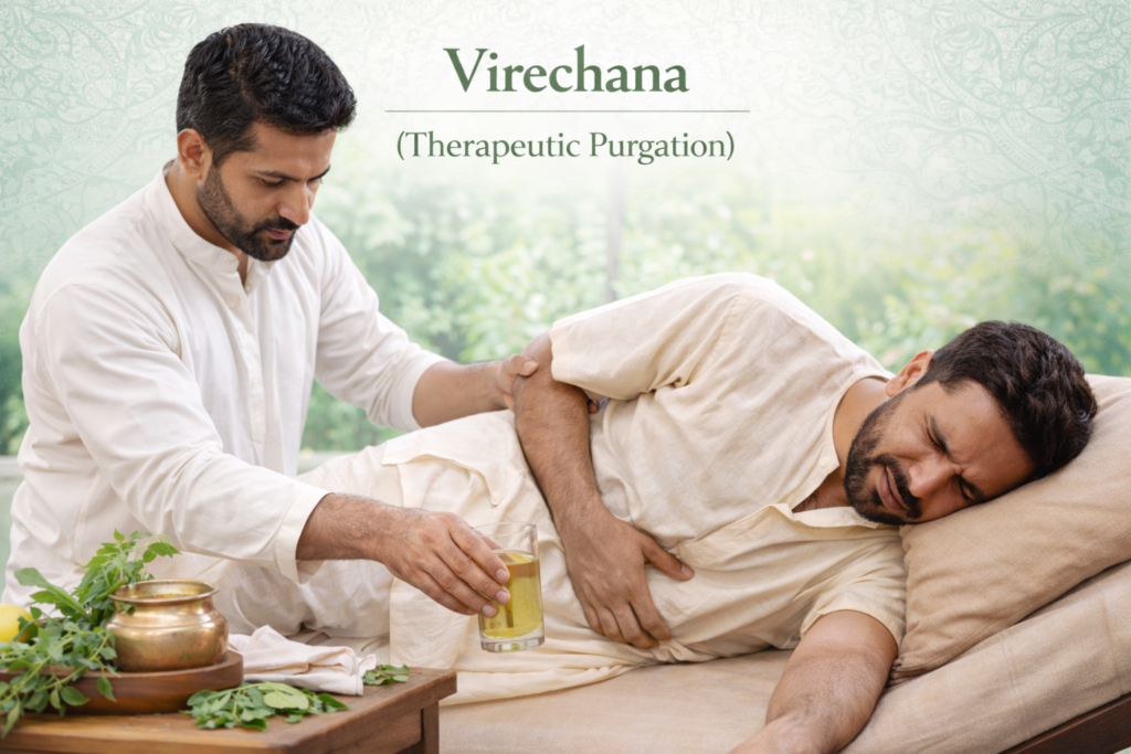 Virechana is a gentle cleansing therapy aimed at removing excess Pitta dosha. It detoxifies the liver and intestines, supports skin health, improves digestion, and helps manage hormonal and inflammatory disorders.