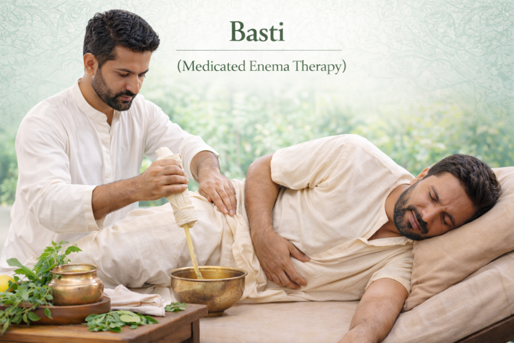Basti is one of the most important Panchakarma therapies used to balance Vata dosha. Herbal decoctions or medicated oils are administered rectally to treat joint disorders, back pain, neurological conditions, constipation, and chronic Vata-related diseases.