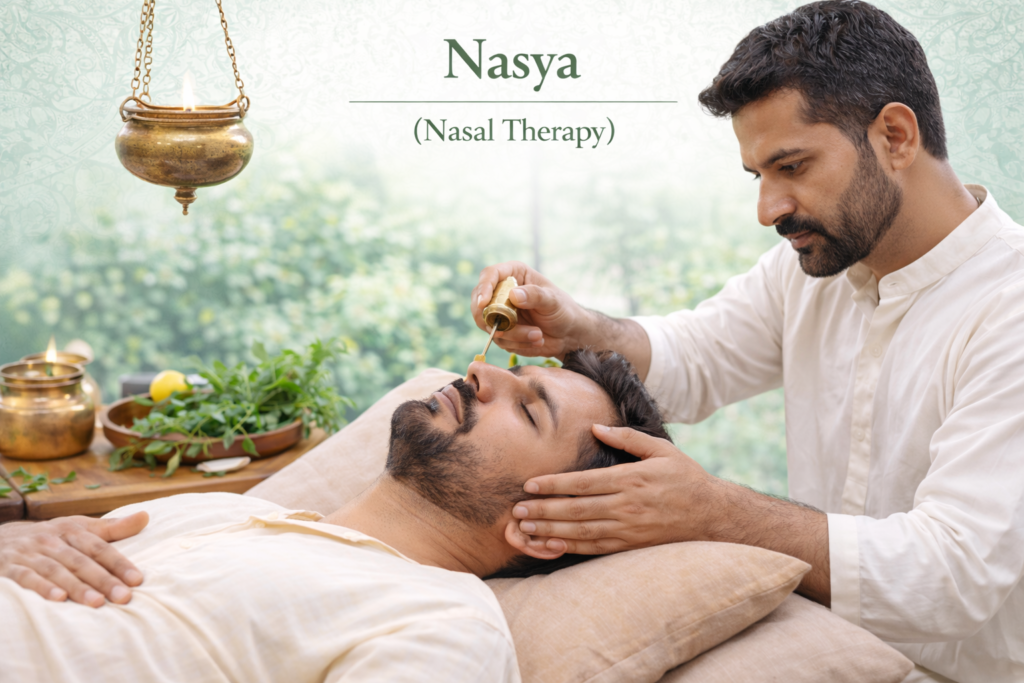Nasya involves administering medicated herbal oils or drops through the nasal passage. It helps cleanse toxins from the head region and is effective for sinusitis, migraine, hair fall, cervical pain, stress, and sleep disturbances.