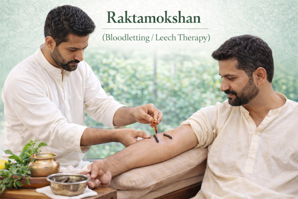Raktamokshana is a specialized purification therapy used for removing impure blood and improving circulation. It is recommended in certain chronic skin conditions, inflammatory disorders, acne, and non-healing wounds under expert supervision.