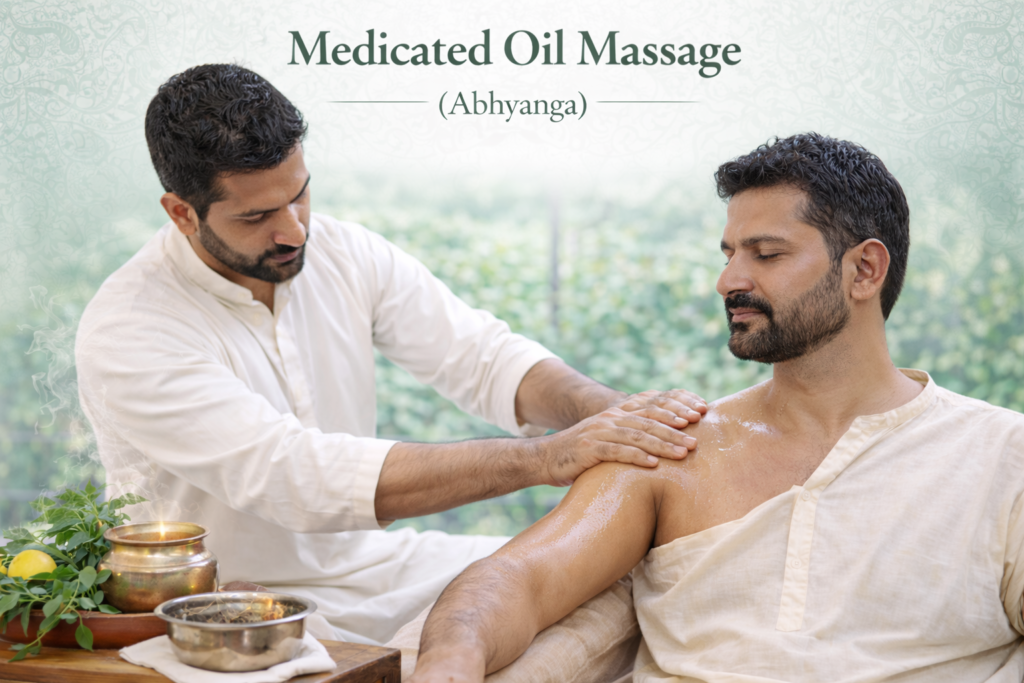 Abhyanga is a therapeutic full-body massage performed using warm herbal oils selected according to the individual’s body constitution. This therapy nourishes tissues, improves blood circulation, reduces stiffness, relieves stress, and prepares the body for deeper detoxification procedures.